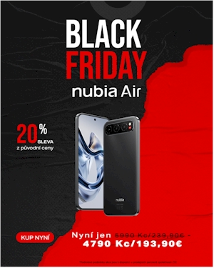 Největším lákadlem je rozhodně novinka nubia Air, která zaujme ultratenkým designem, vysokou odolností proti vodě a prachu a skvělým poměrem ceny a výkonu. Během Black Friday ji zákazníci pořídí jen za 4890 Kč / 198,90 €, tedy s téměř 20% slevou oproti běžné ceně 5990 Kč / 239,90 €.